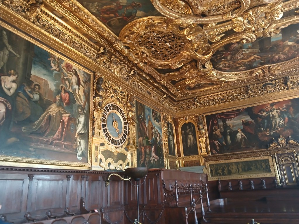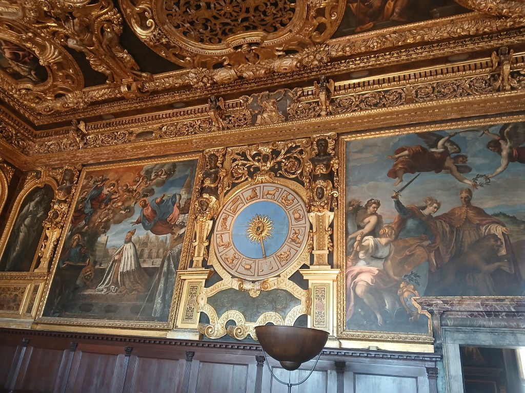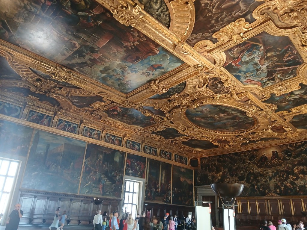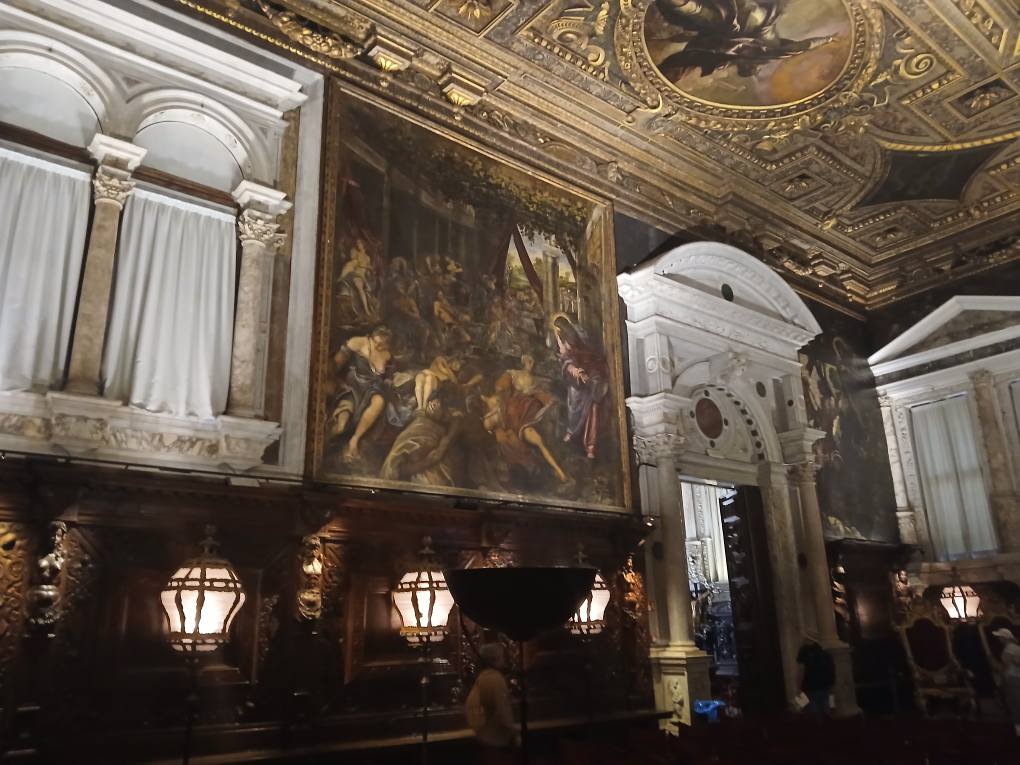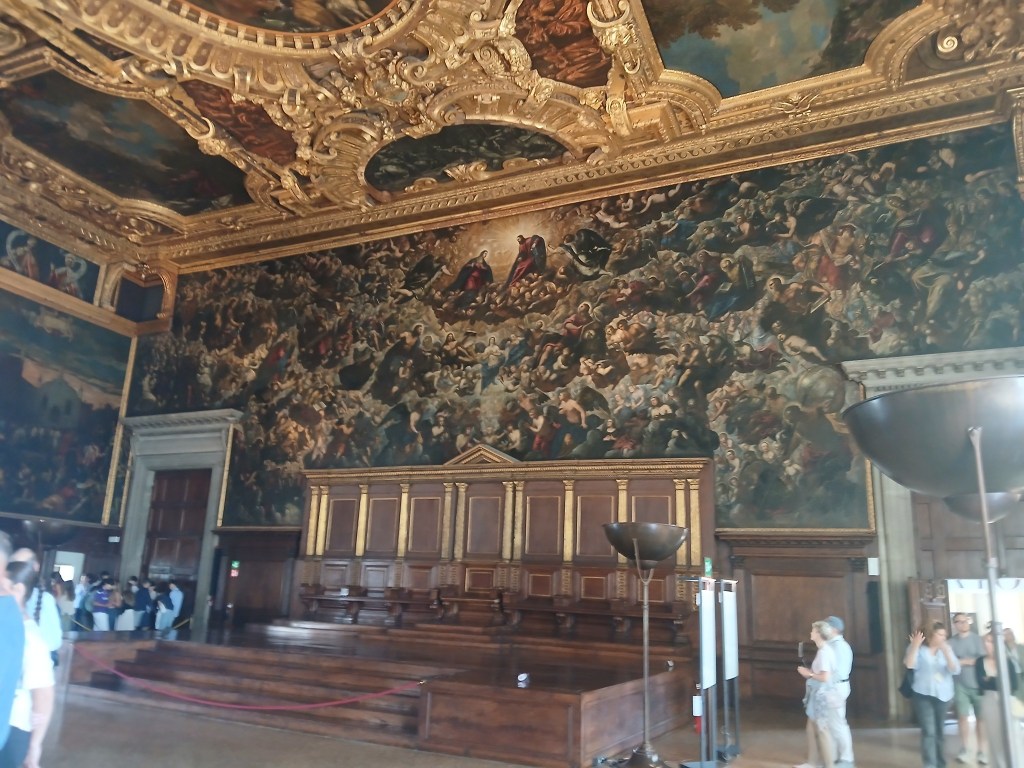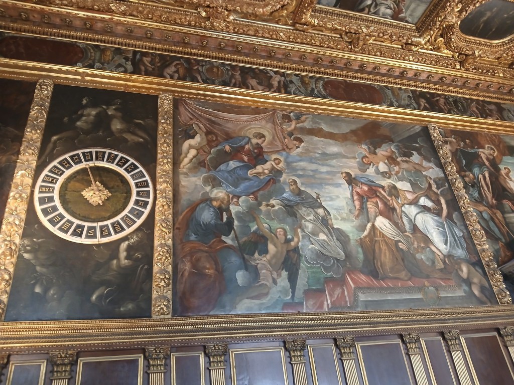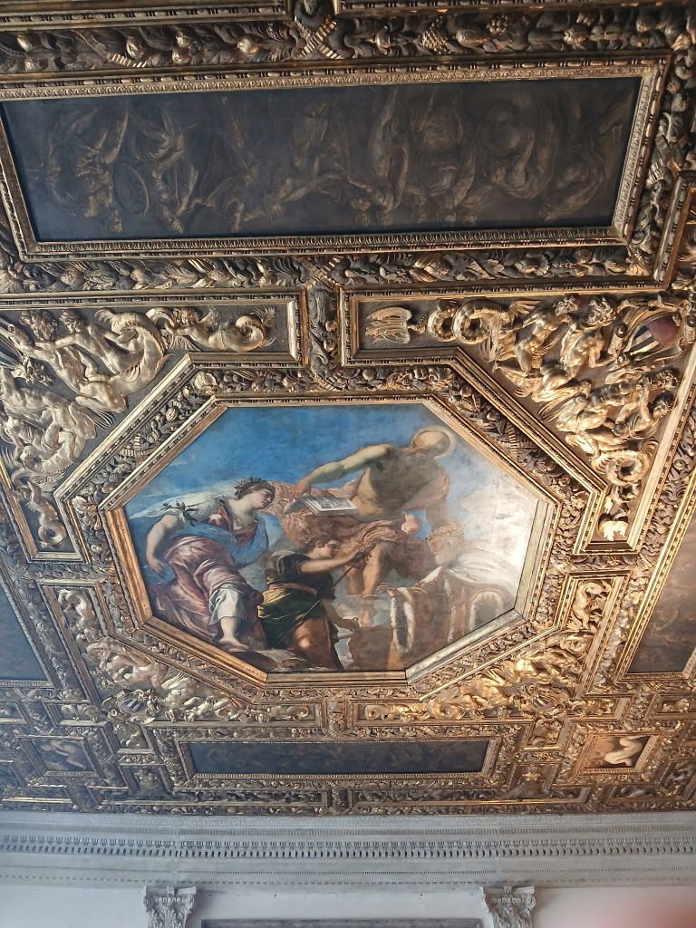 After a cappuccino and cornetto, we headed to Piazza San Marco to visit the always somewhat overwhelming Palazzo Ducale, with the great rooms decorated by Tintoretto, Veronese, and other Venetian masters. Rooms overflowing with history, as this was where the Doge, the Consiglio dei Dieci, the Maggior Consiglio, the Senato, the various courts, met and ruled the vast Repubblica Serenissima di Venezia for centuries.