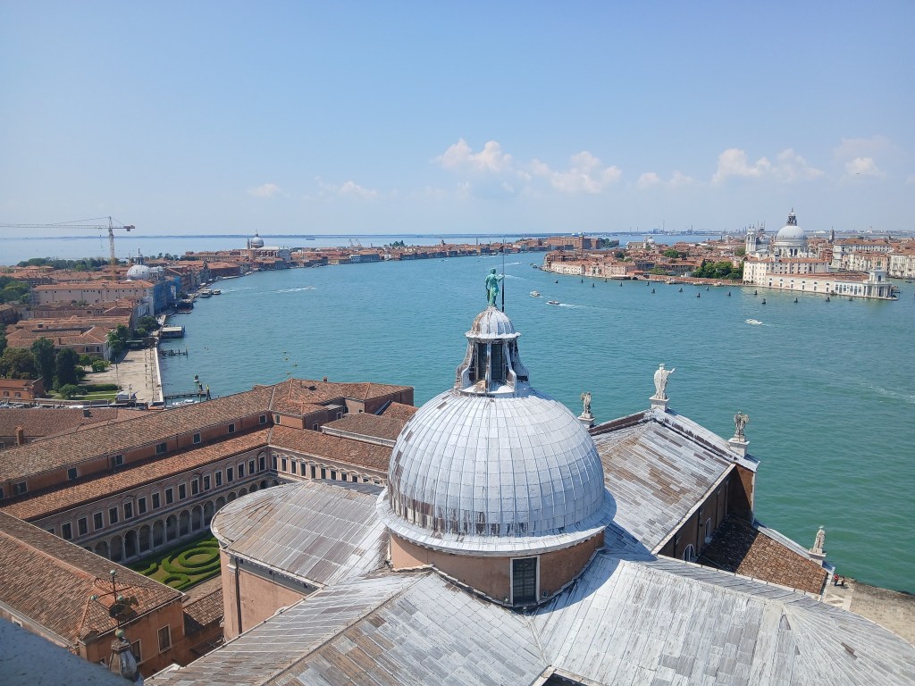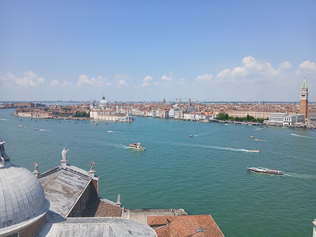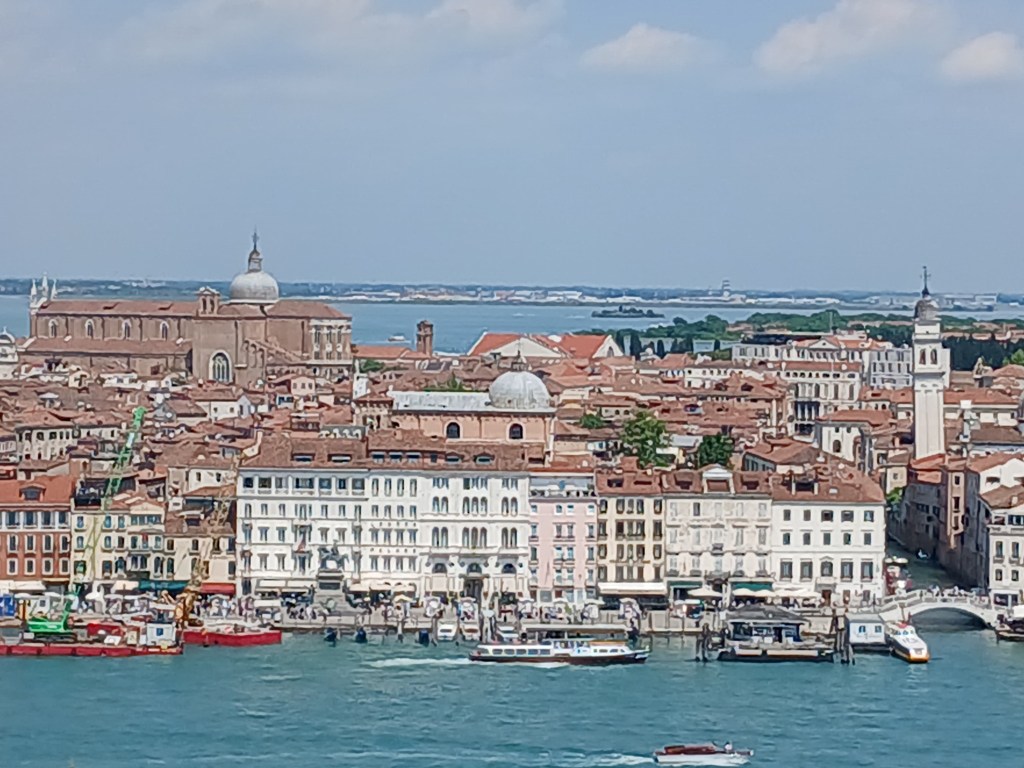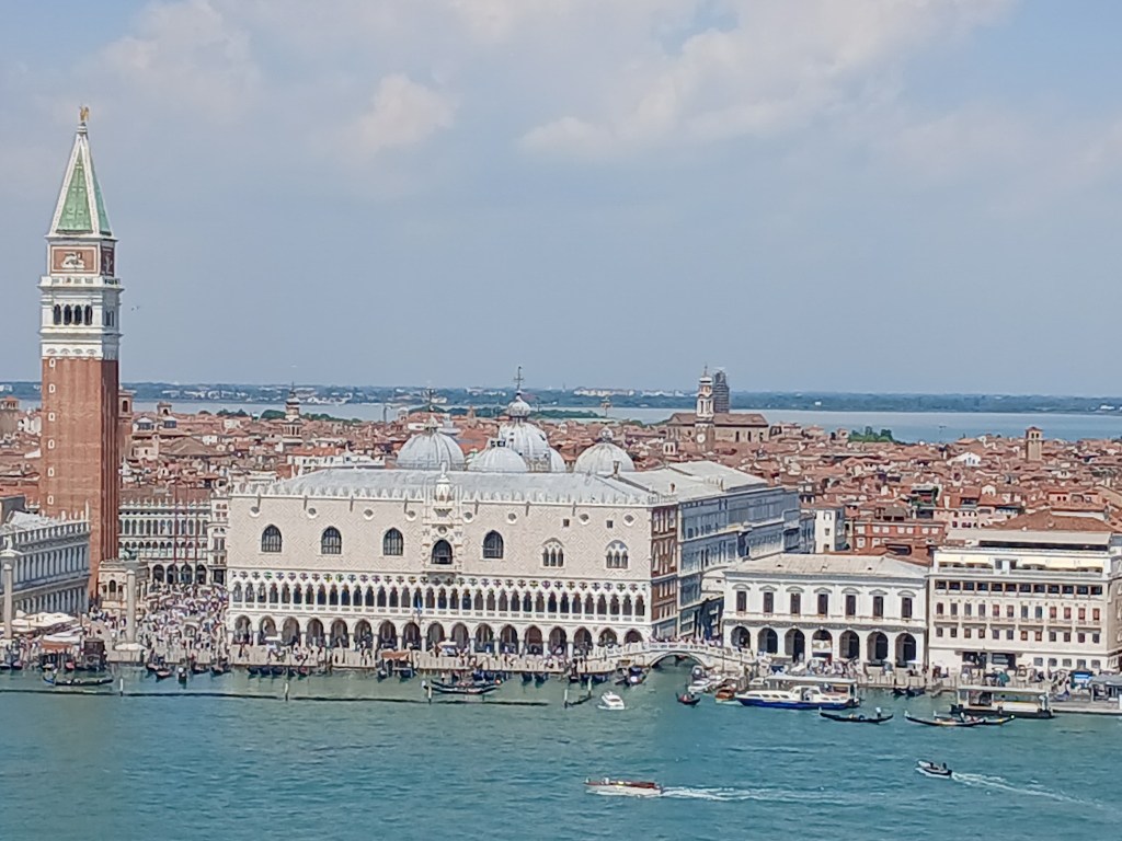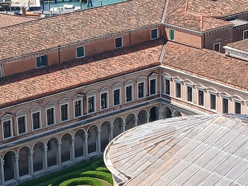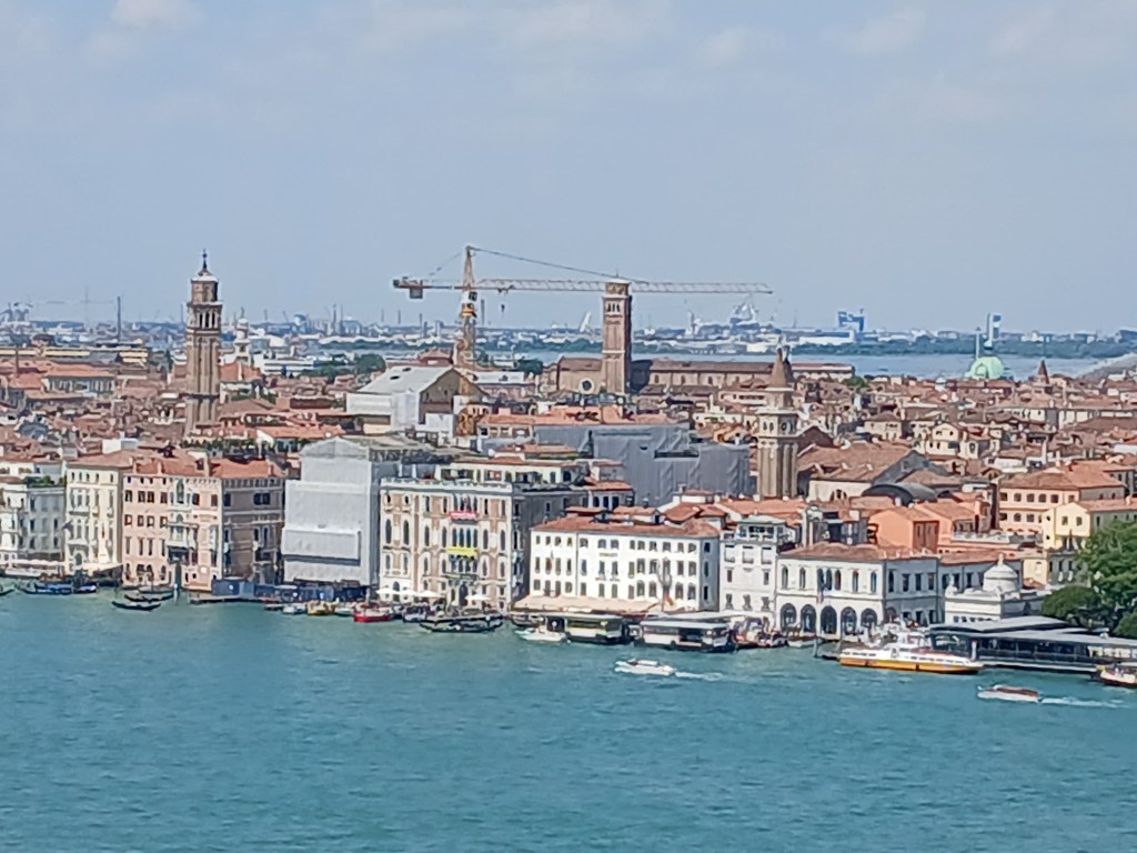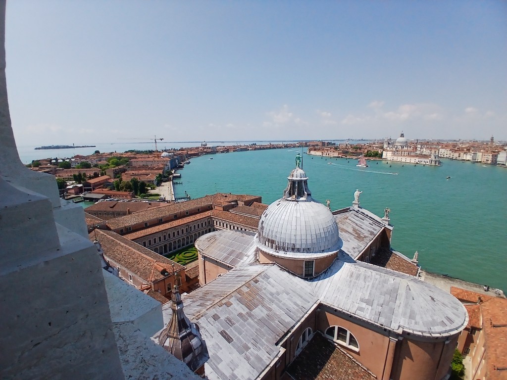 Fortified with delicious cappuccino and a cornetto, we set out by vaporetto to Palladio’s church of San Giorgio Maggiore on the eponymous island across the Bacino di San Marco. While there we took the elevator to the top of the church’s campanile for extraordinary views of the city.