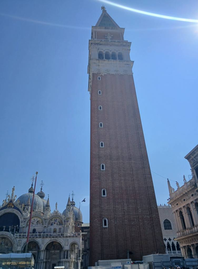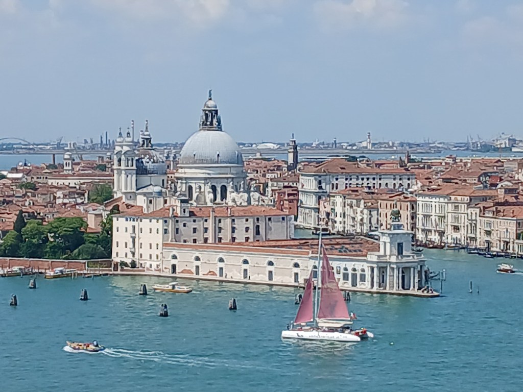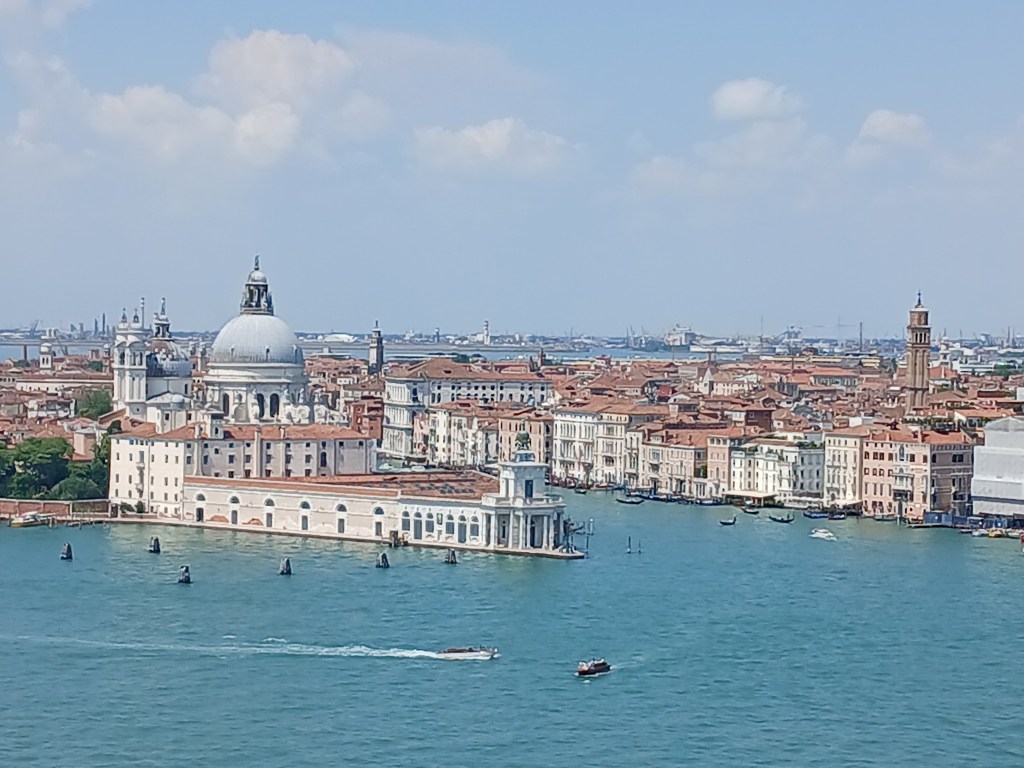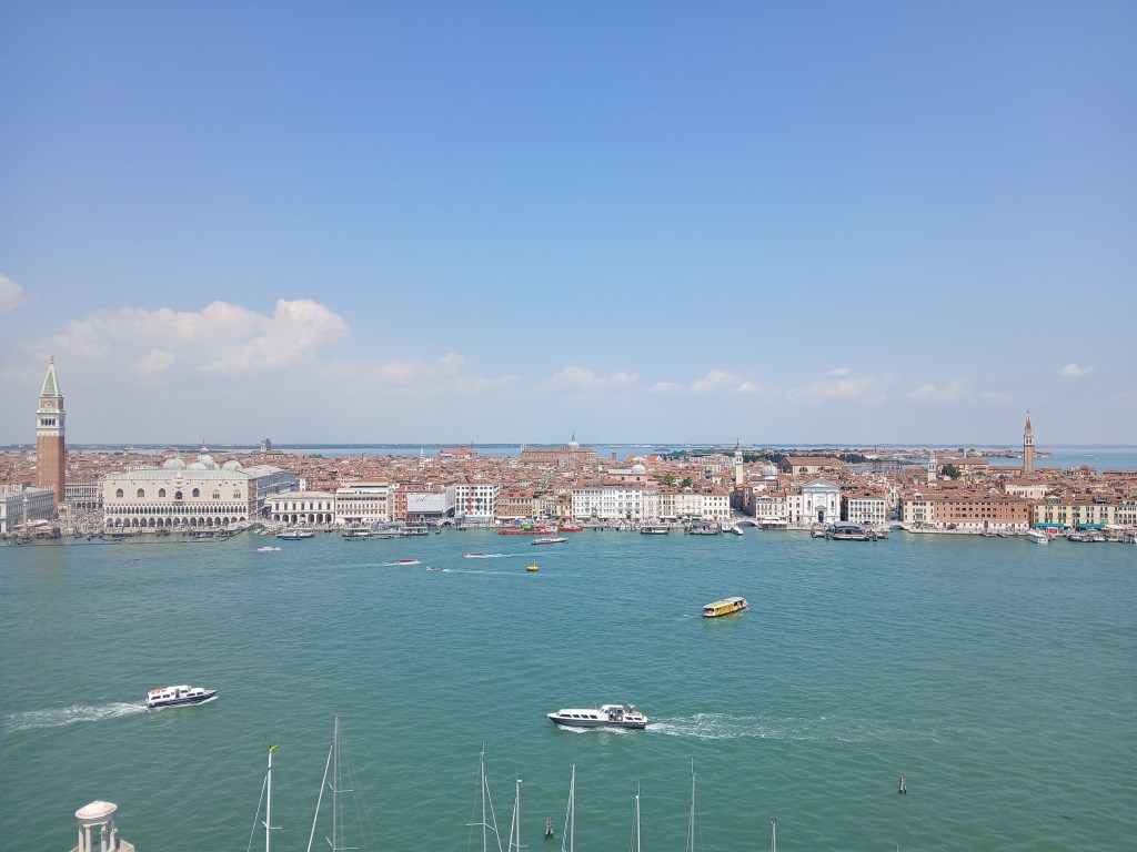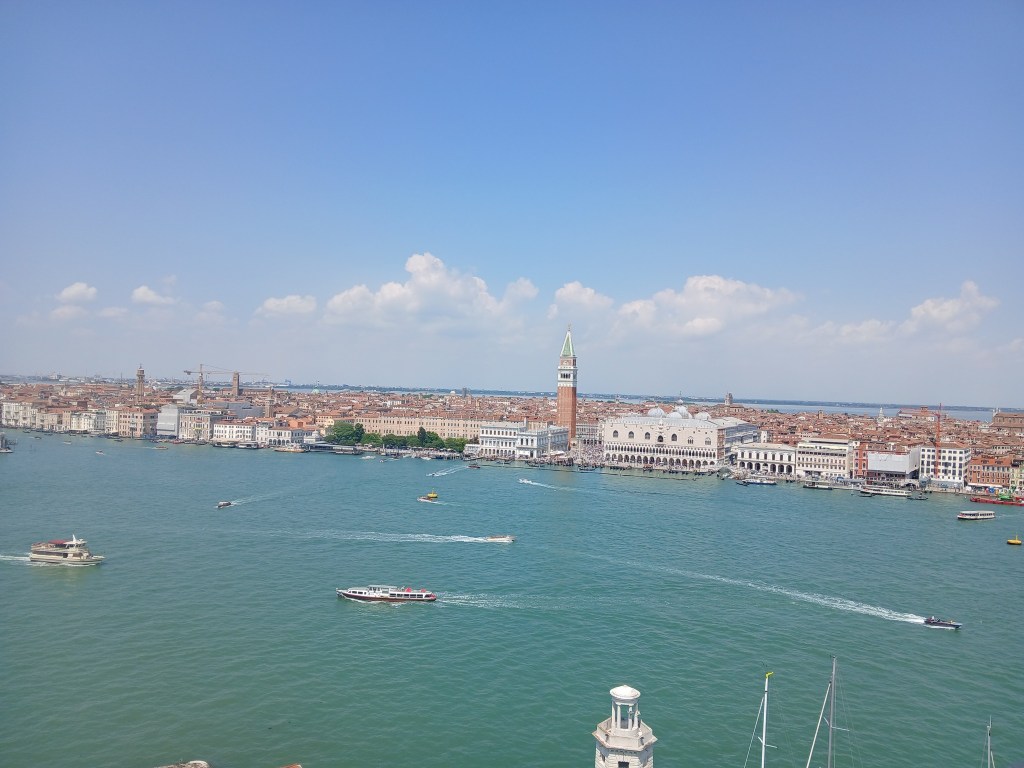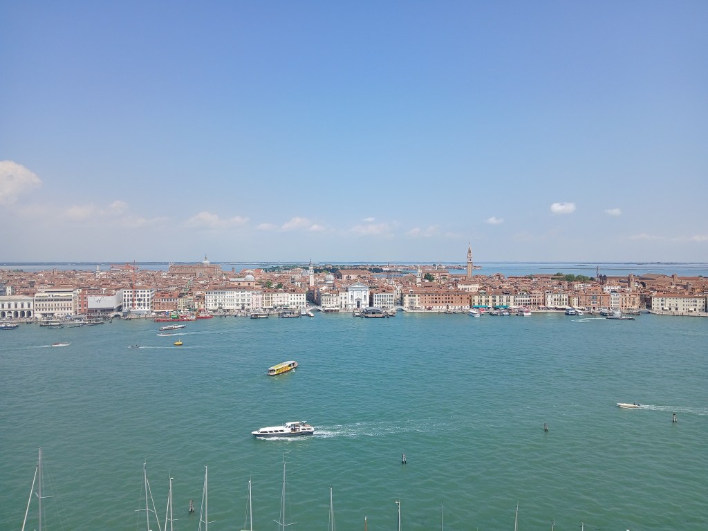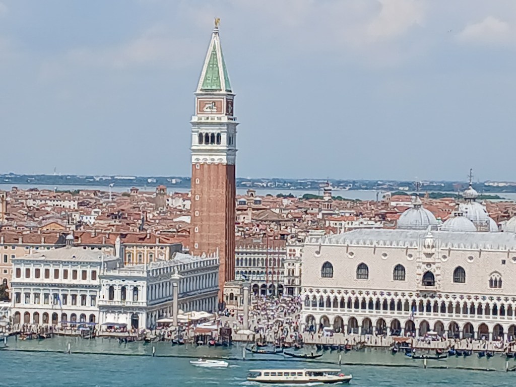 Fortified with delicious cappuccino and a cornetto, we set out by vaporetto to Palladio’s church of San Giorgio Maggiore on the eponymous island across the Bacino di San Marco. While there we took the elevator to the top of the church’s campanile for extraordinary views of the city.